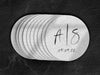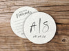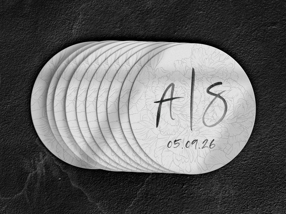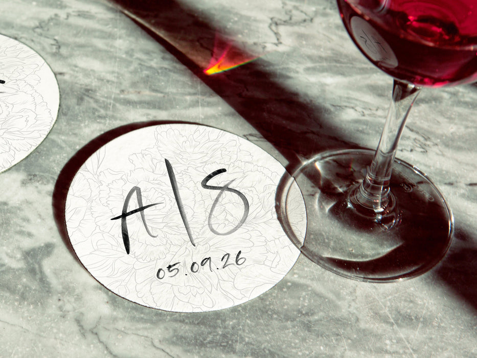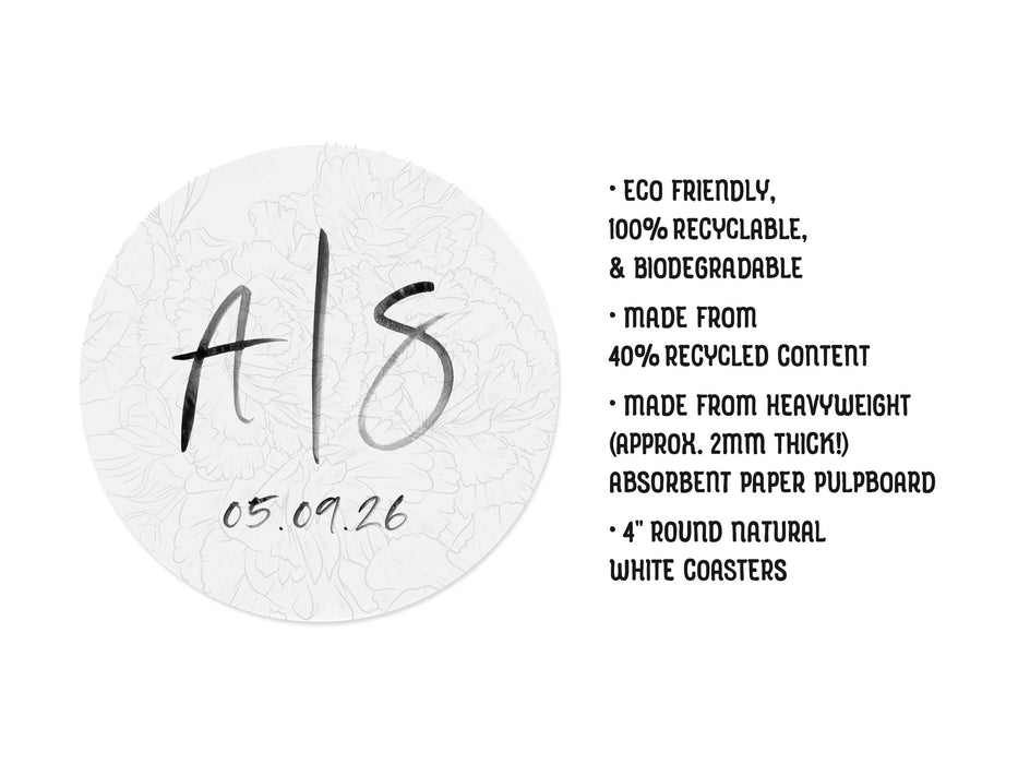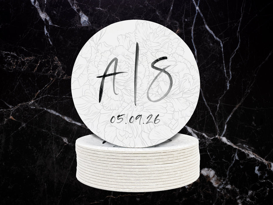Add a personal touch of floral elegance to your wedding reception tables with our Floral Initial coasters. These heavyweight paper coasters are designed with a beautiful floral lineart overlay and customized with the bride and groom's first name initials and wedding date in a brush script font.