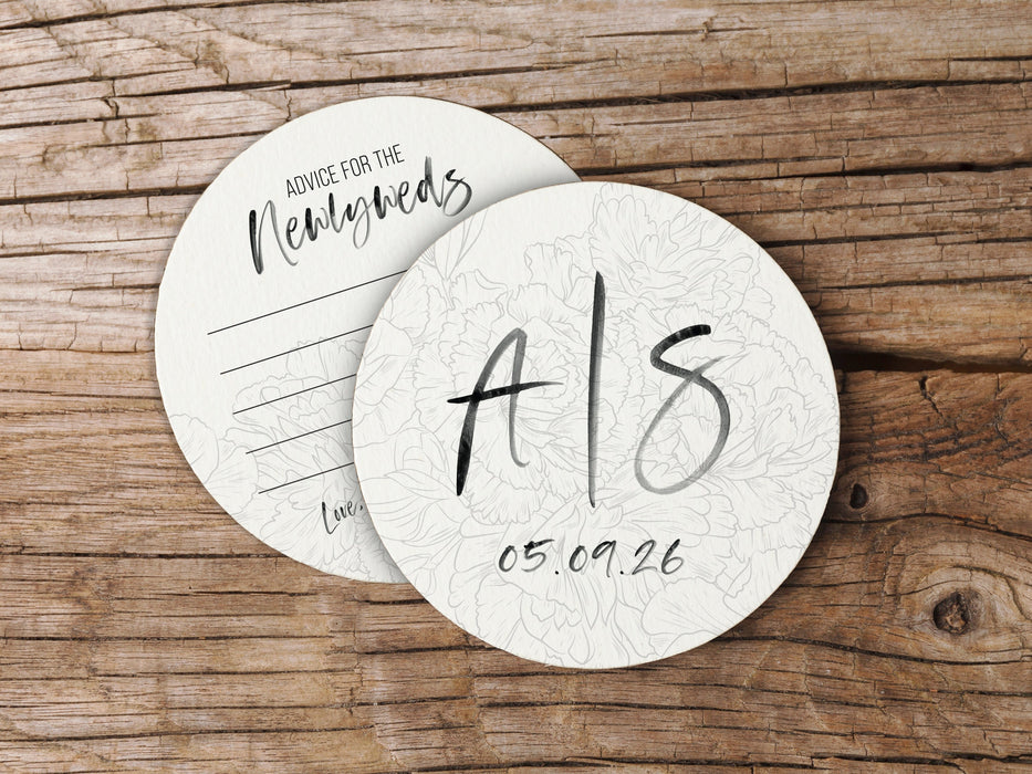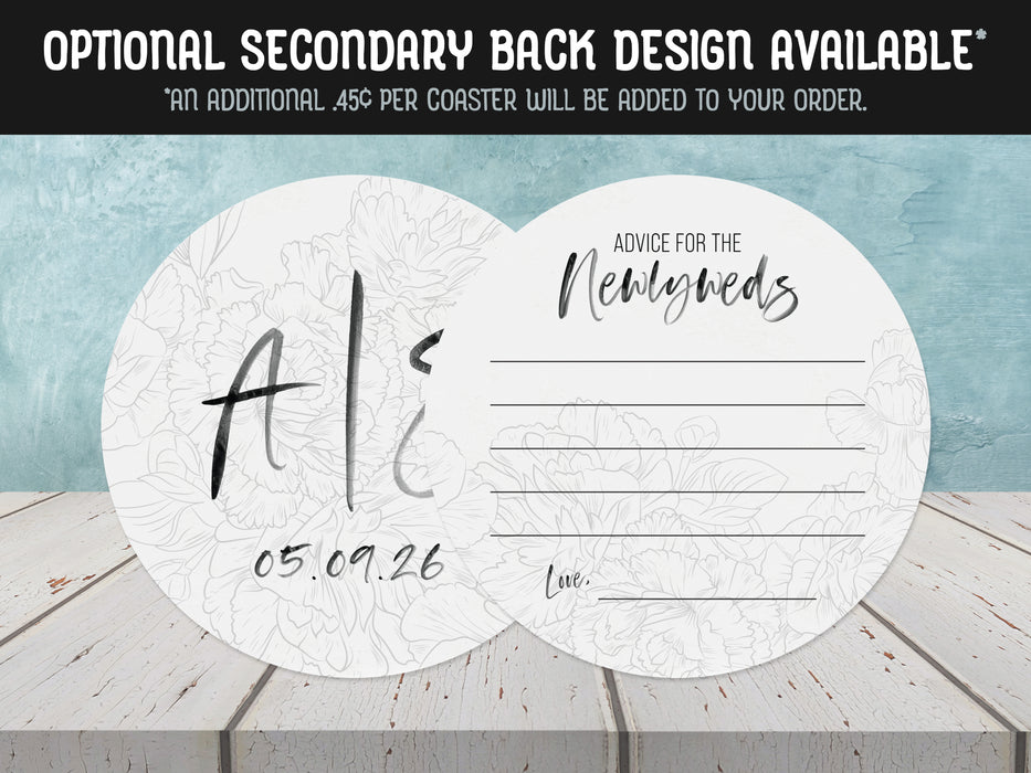 Want to add a fun twist to your wedding guestbook? We also offer an optional secondary back design for these coasters that allows your guests to write their advice for the newlyweds. *Please note: When ordering coasters with the front and back designs, an additional .45¢ per coaster is added according to the number of coasters in your order.*