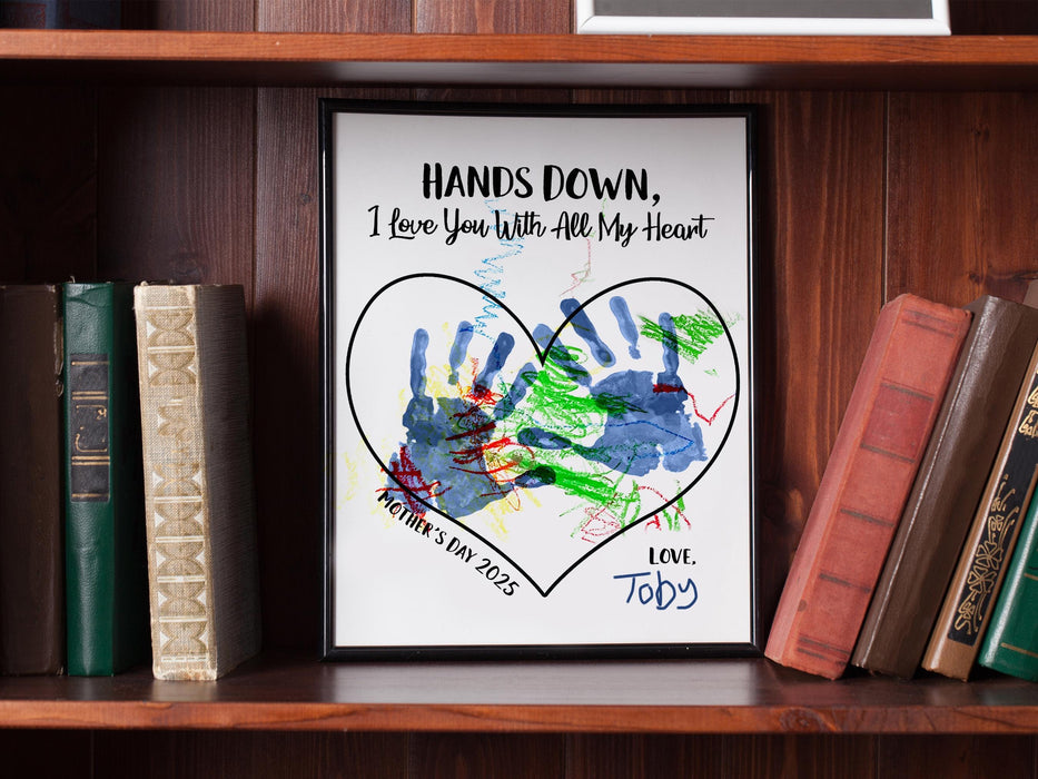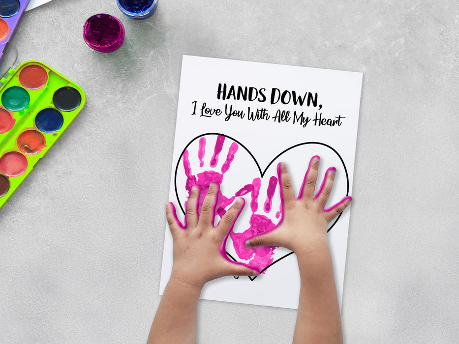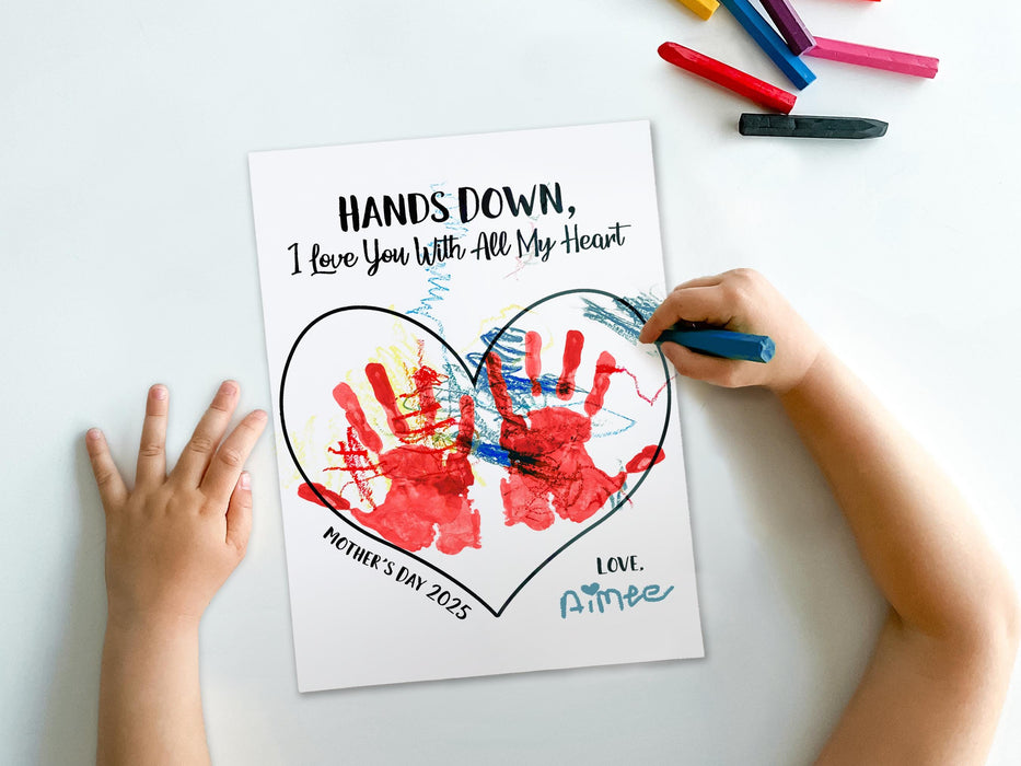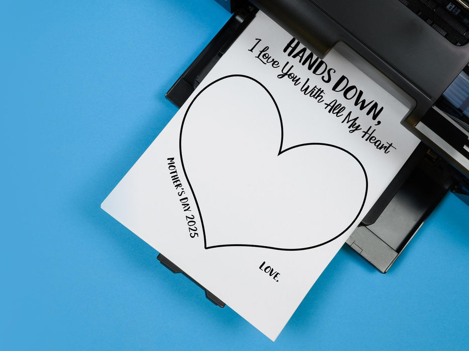Celebrate Mom with a heartfelt gift using our "Hands Down! I Love You With All My Heart" digital download. This 8.5 x 11 inch printable features a sentimental message and heart outline, perfect for little hands to leave their mark with paint, markers, or ink. Ideal for creating a unique Mother's Day gift, this design captures a moment in time and transforms it into a cherished memory. Simply download, print, and let your child’s creativity shine. Whether it’s from toddlers, preschoolers, or older kids, this easy and meaningful craft is sure to bring a smile to Mom’s face. Download your design today and create a gift that Mom will treasure forever!